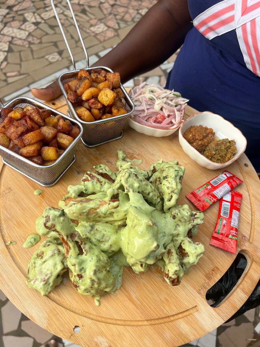 Découvrez notre plateau gourmand de poulet en sauce verte , accompagnées de frites de plantain croustillantes et d'oignons marinés. Parfait pour un repas convivial ou une soirée entre amis. Savourez des saveurs exotiques tout en profitant de textures variées. Idéal pour les amateurs de cuisine innovante et savoureuse.