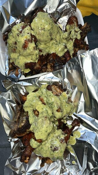 Demi-poulet rôti, généreusement recouvert de sauce blanche maison, idéal pour livraison rapide et repas individuel. Accompagnements disponibles : frites, alloco, attiéké.