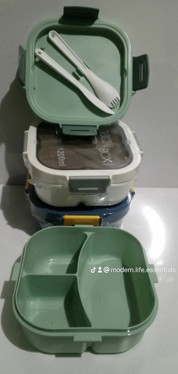 1200 ml capacity, free spoon , free fork , 3 compartment , transparent lid , 4 side lock , silicone lining lid , thick and heavy , available in white . Blue And green