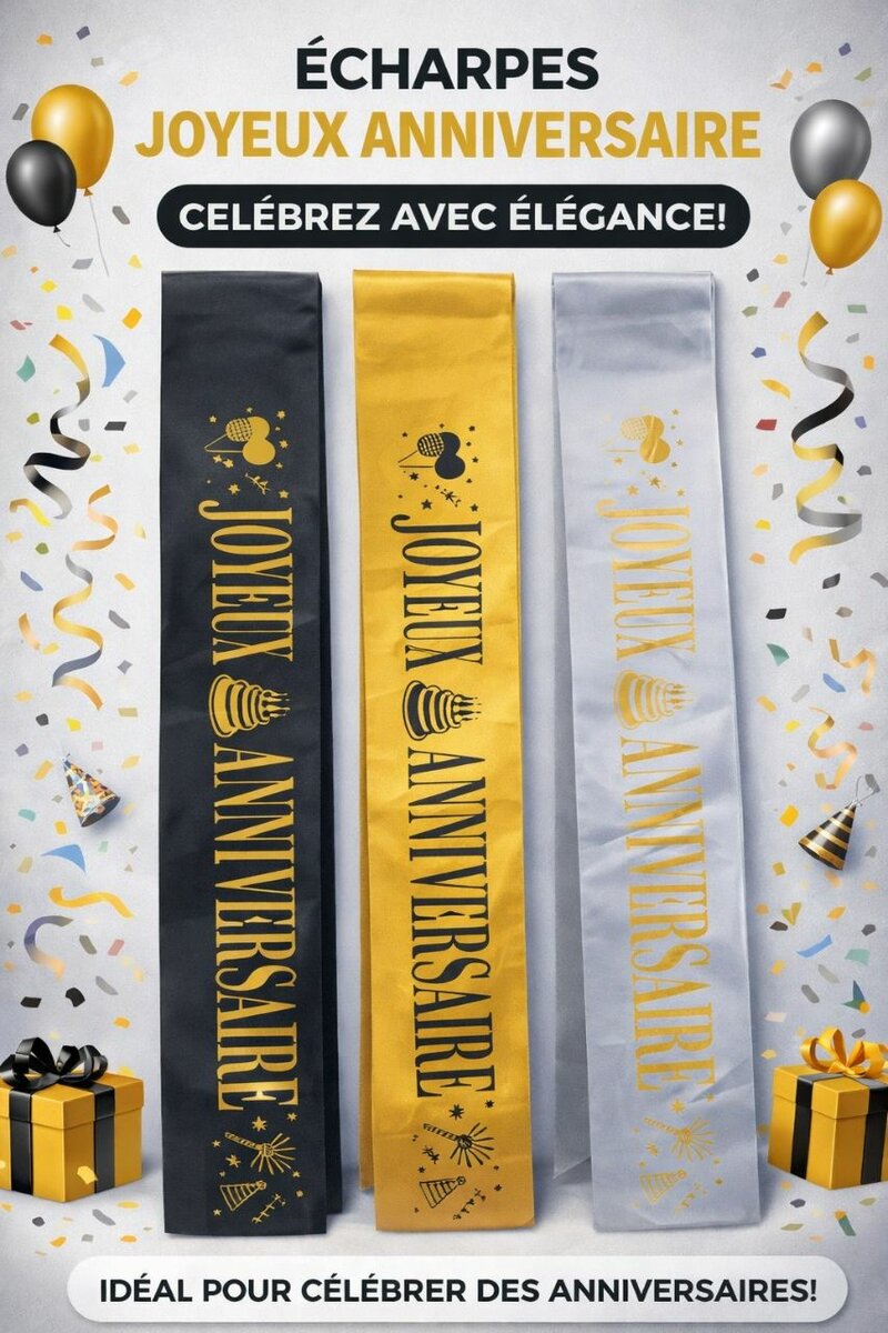 Décorez votre anniversaire avec nos écharpes 'Joyeux Anniversaire' en noir, jaune et gris. Parfaites pour une célébration élégante et festive. Faciles à utiliser et réutilisables.