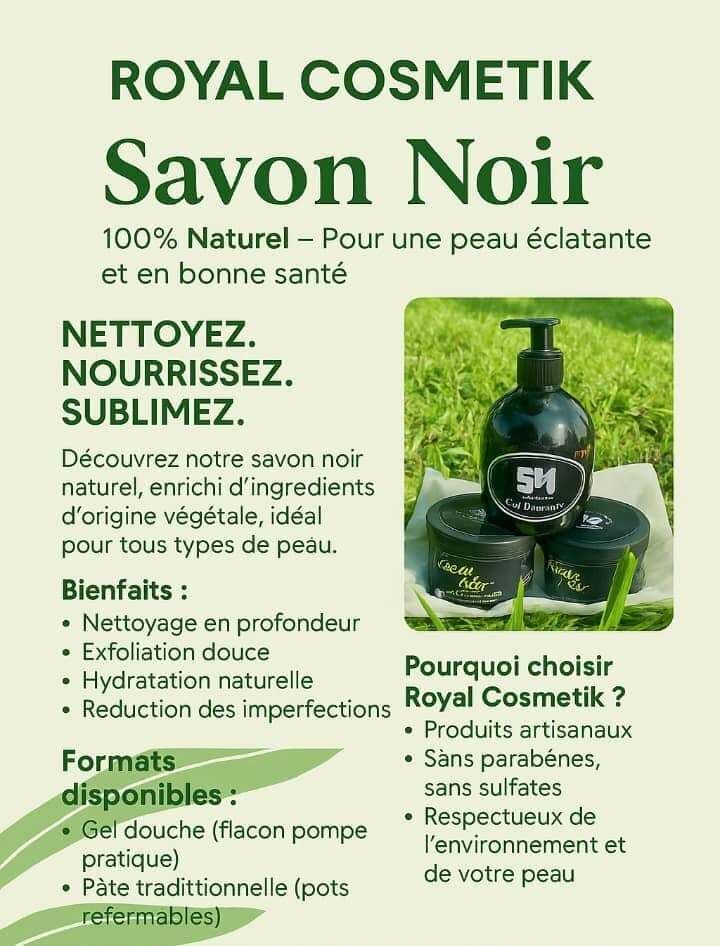 Le savons noir Royal consmetic est un savons qui nettoie la peau en profondeur, il protège il purifie, il fini les bouton les dattes, les tâches noir et les acnés.