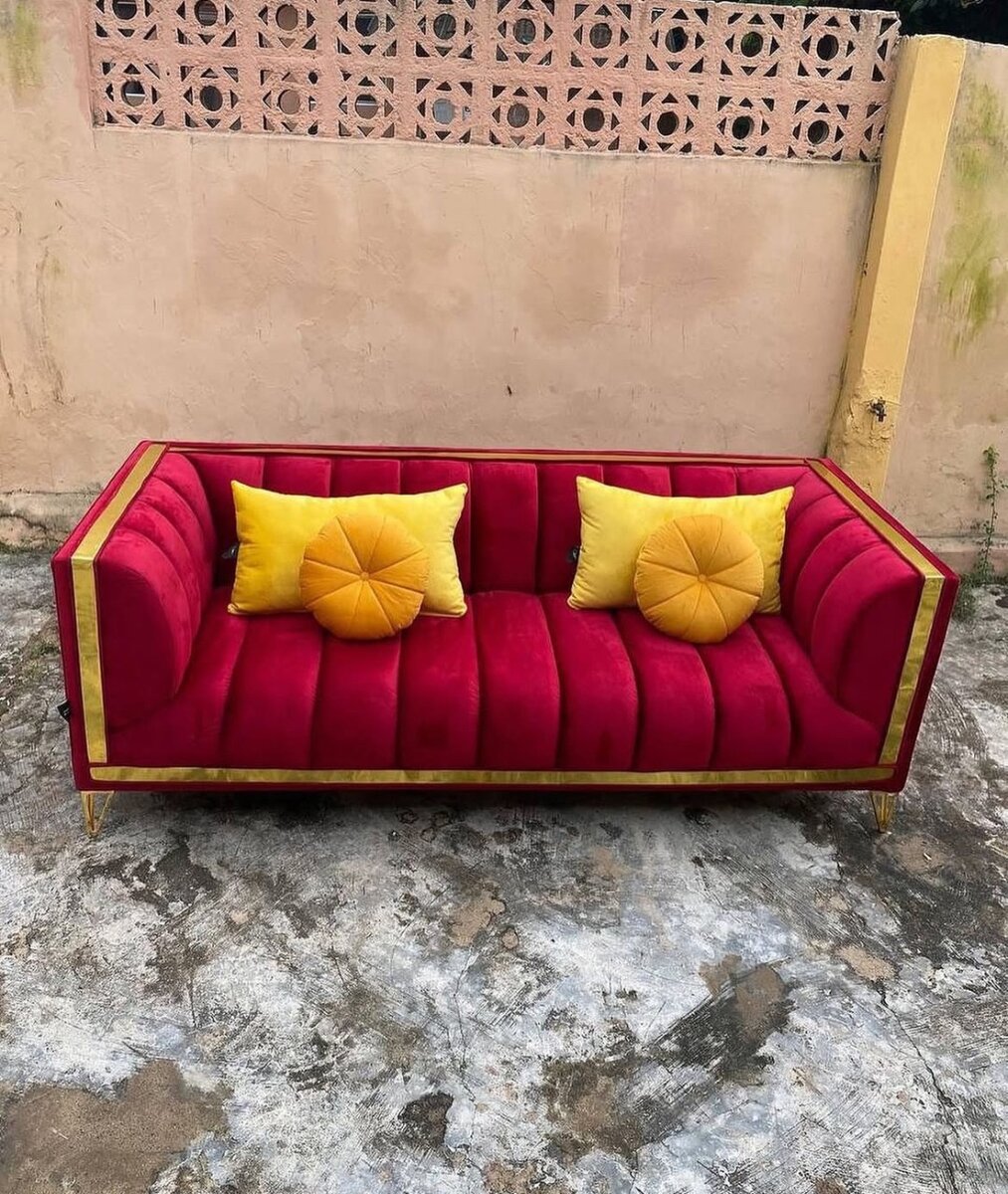 3 seater with gold outline and imported legs. Can be made in various colors and set free throw pillows