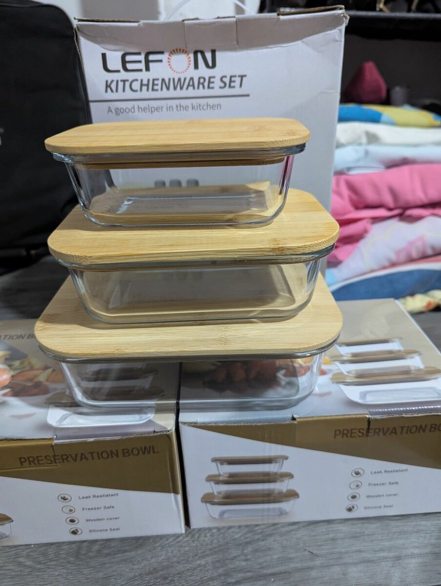 3 set glass bowls with airtight wooden cover. It's heavy and a high quality product
