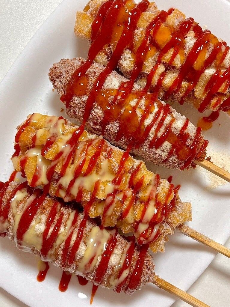 Savourez nos corn dogs coréens croustillants, nappés de sauces délicieuses. Un en-cas parfait pour les fêtes ou une pause gourmande.