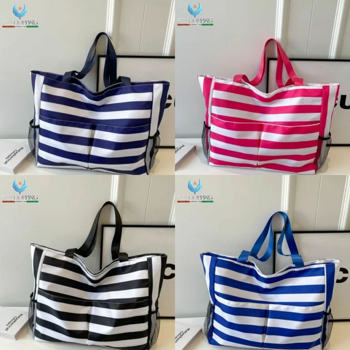 Sac de plage rayé imperméable et léger, parfait pour la plage, la piscine ou les voyages. Disponible en plusieurs couleurs.