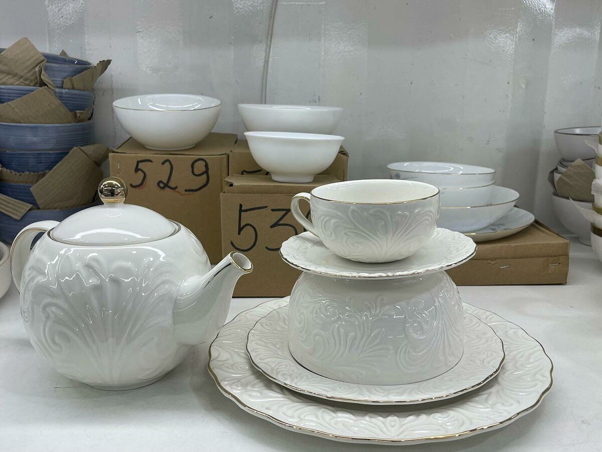 •Постановочная тарелка 6 •Закусочная тарелка 6 •Десертная тарелка 6 •Супница 6 •Кружка 6 •Чайник 1