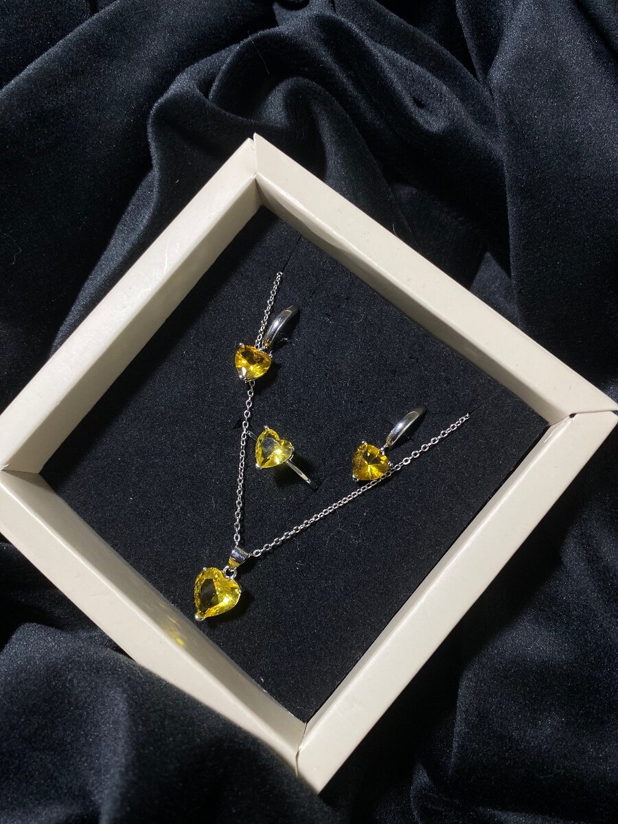 Серебро 925 ~ Серьги , цепочка и кольцо. Желтый и белый каме