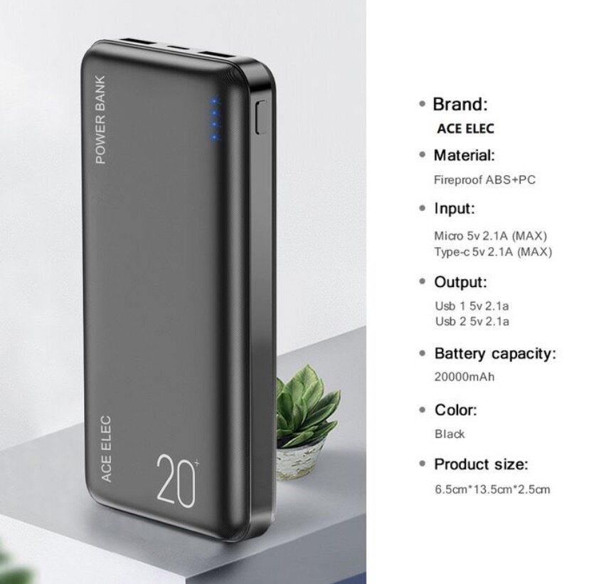 Ace Elec PowerBank 20,000 mAh 2 input ports USB C & Micro USB 2 output ports USB A = 2 Battery last long and very strong.