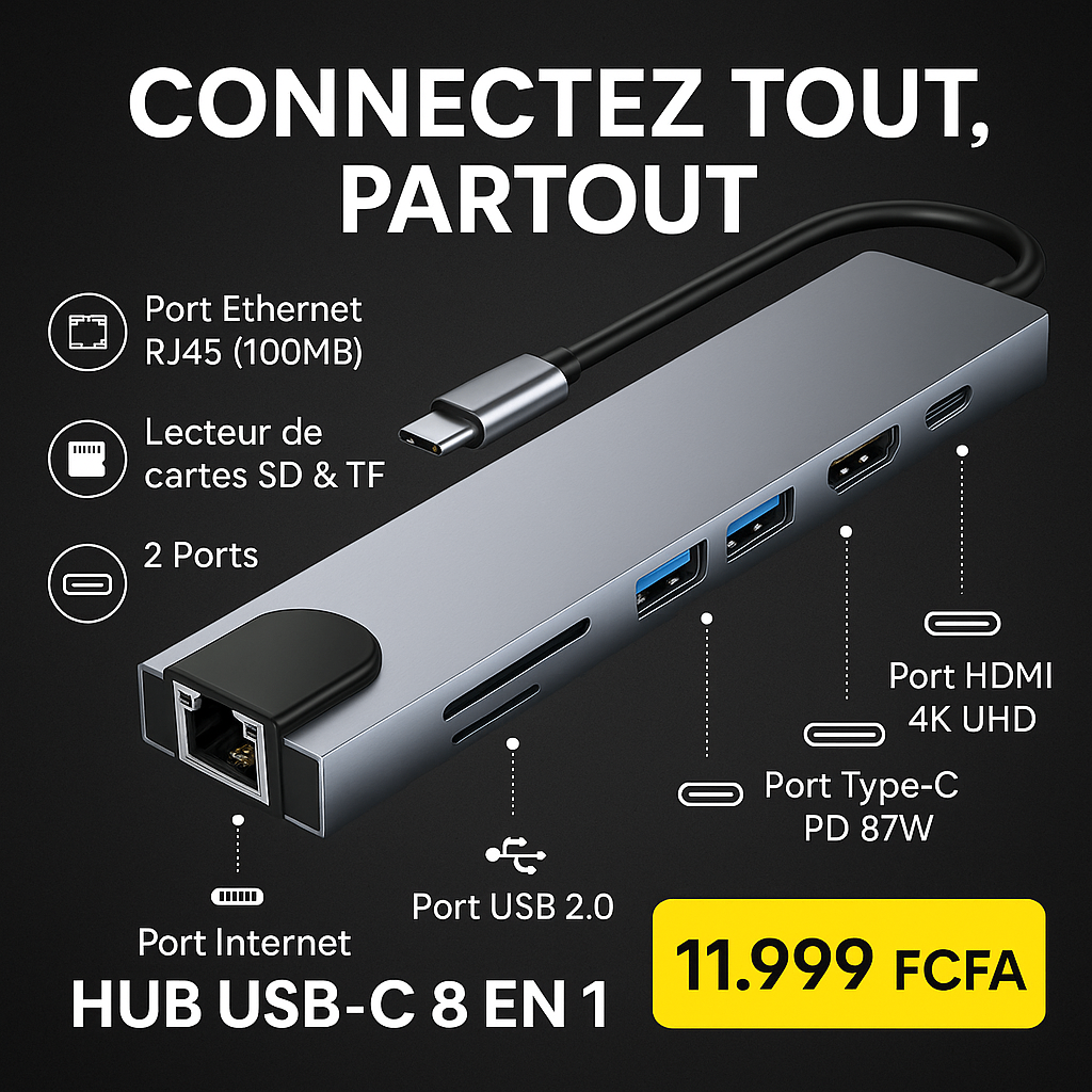 Optimisez la connectivité de vos appareils avec cet adaptateur USB-C 8 en 1. Connectez-vous facilement grâce à ses ports HDMI 4K UHD, Ethernet RJ45, USB 3.0 et USB 2.0. Idéal pour les professionnels et étudiants.