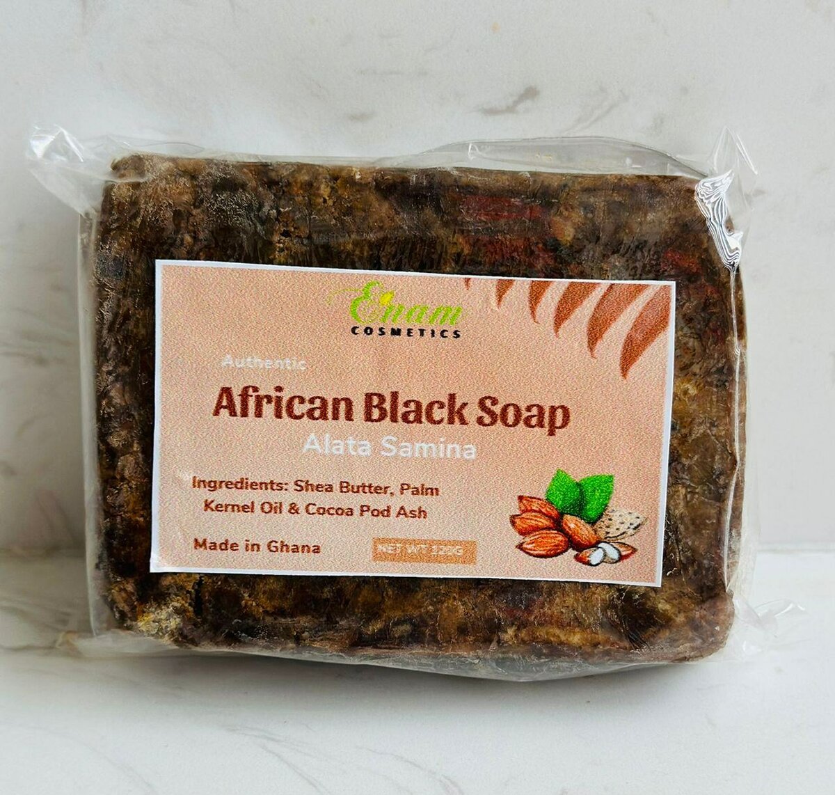 Enam African Black Soap is made from shea butter, palm kernel oil and cocoa pod ash which deeply cleanses the skin
