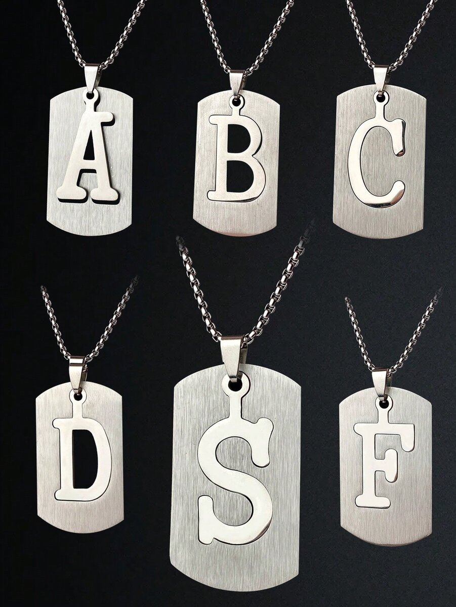 Stainless steel dog tag necklaces with personalized alphabet cutouts. Durable and stylish for everyday wear. Perfect gift for friends and loved ones. Adjustable chain included.