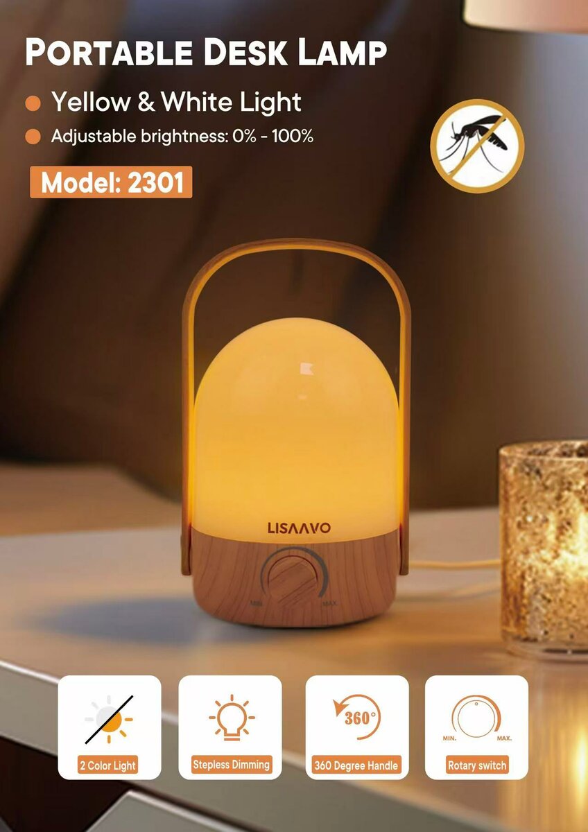 Anti-Mosquitoes / No mosquitoes around Enhance your workspace with the Lisavo Portable Desk Lamp. Featuring yellow and white light, seamless dimming, and a 360-degree handle, it's perfect for any setting.