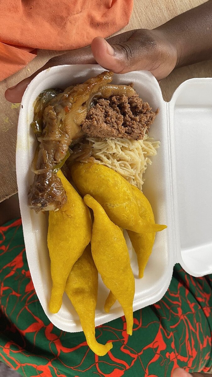 Les beignets jaune accompagné de viande hachée , petits poids, vermicelles et pâtes de poulet