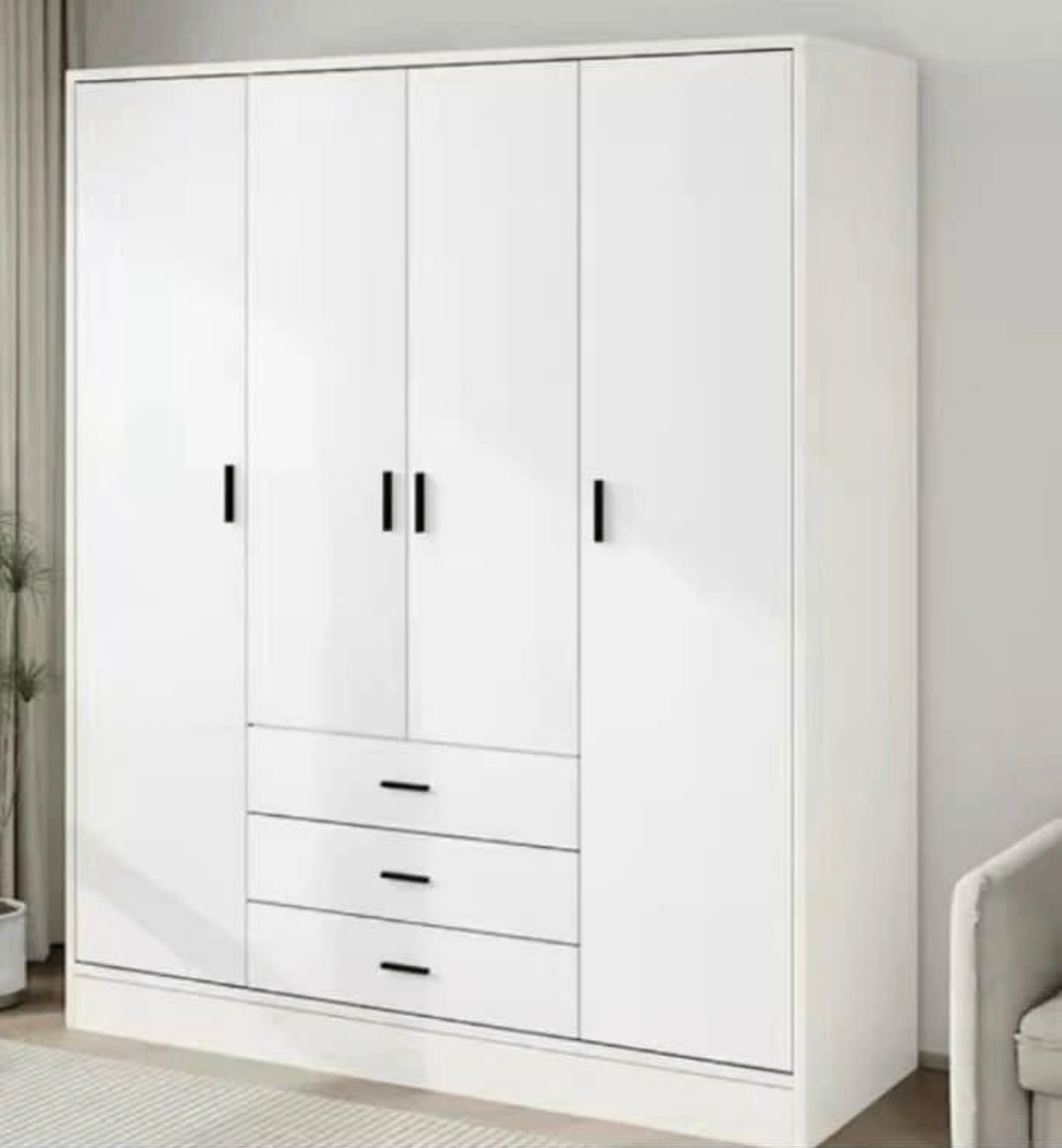 Découvrez cette armoire blanche élégante avec 4 portes et 3 tiroirs pour un rangement optimal. Parfaite pour votre chambre, elle offre un espace de stockage spacieux et un design moderne.