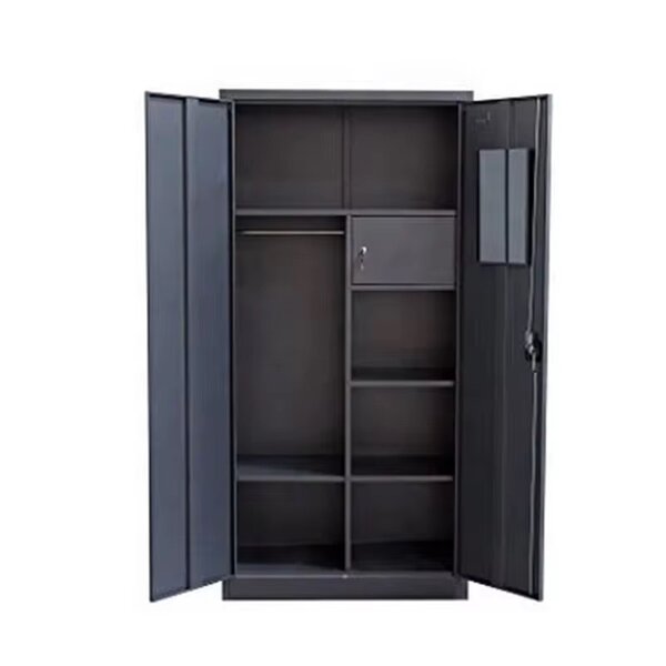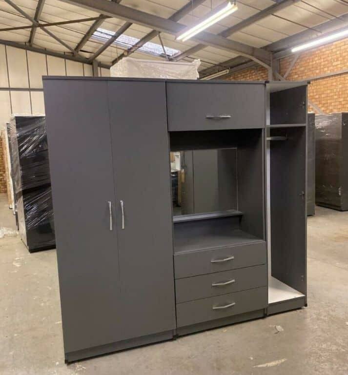 Découvrez cette armoire dressing grise moderne, idéale pour organiser votre espace. Elle comprend des compartiments de rangement, des tiroirs et une zone pour suspendre vos vêtements.