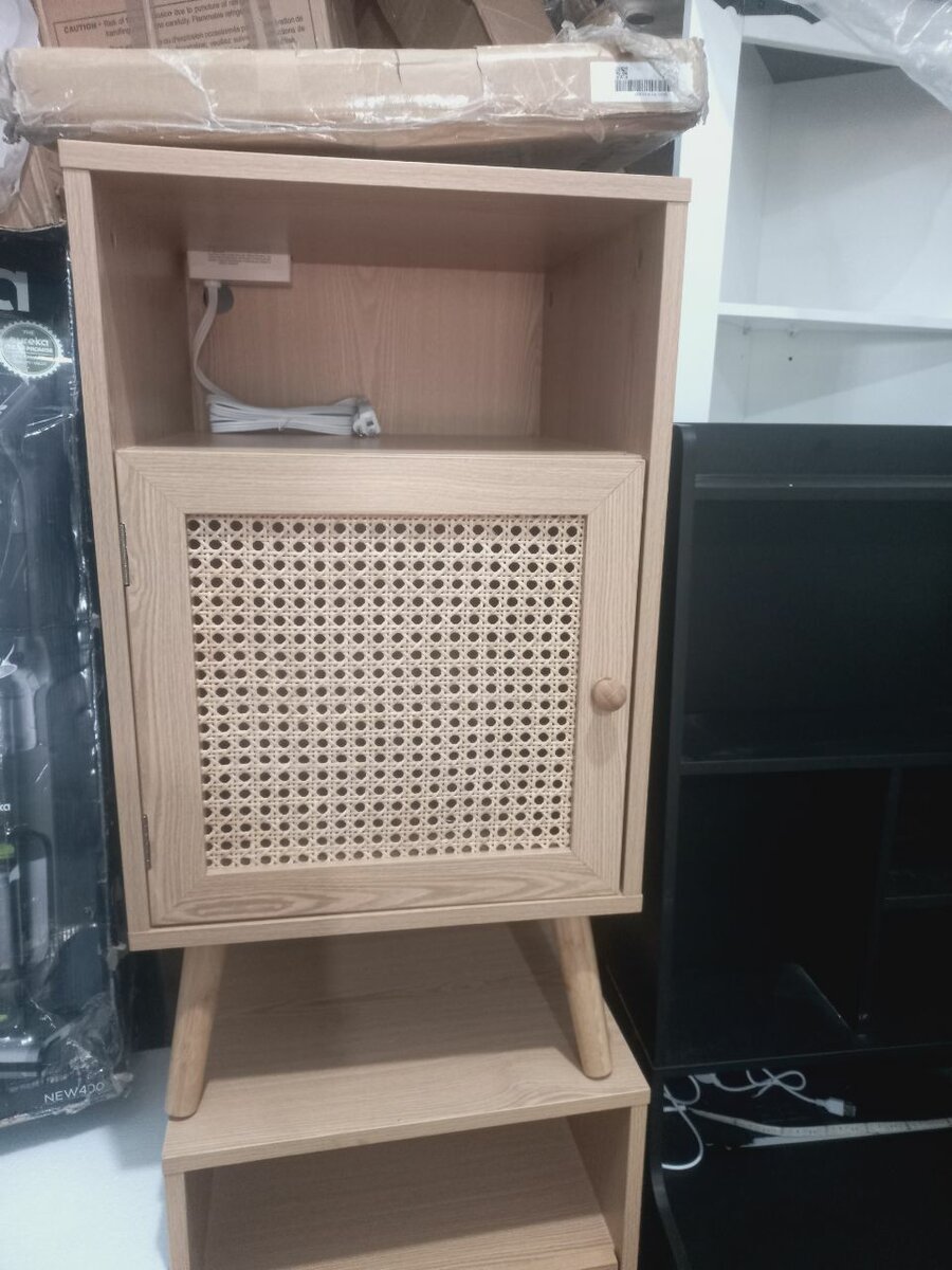 Cette élégante armoire en bois avec une porte en cannage est idéale pour ajouter une touche naturelle à votre intérieur. Parfaite pour le salon ou la chambre, elle offre un espace de rangement pratique pour vos objets personnels. Sa conception moderne et ses pieds inclinés la rendent stable et tendance.