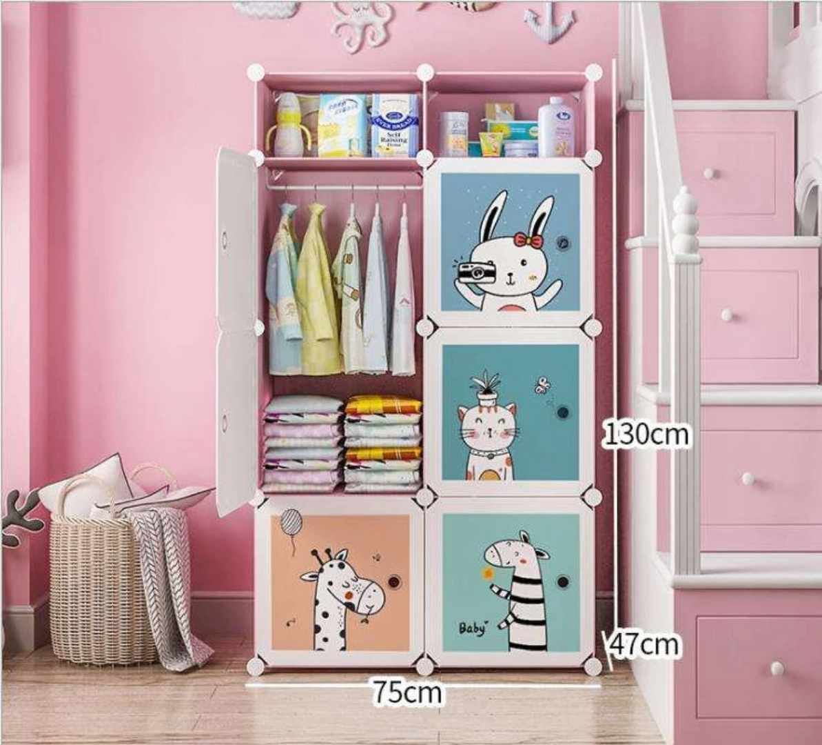 Idéale pour organiser la chambre de votre enfant, cette armoire modulable avec motifs d'animaux est parfaite pour vêtements et jouets. Dimensions compactes de 130x76x37 cm, elle s'adapte à tous les espaces. Facile à assembler, elle ajoute une touche joyeuse et pratique.