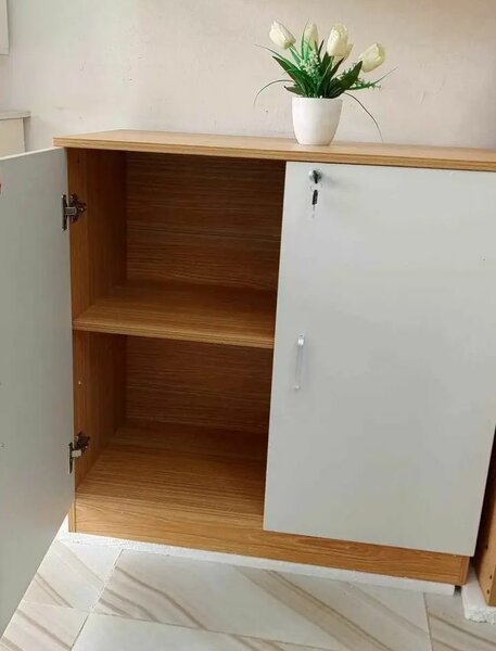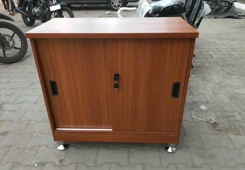 Armoire mobile en bois pratique avec portes coulissantes verrouillables, idéale pour le rangement sécurisé au bureau ou à domicile. Facile à déplacer grâce à ses roulettes robustes. Parfaite pour organiser vos documents et accessoires.