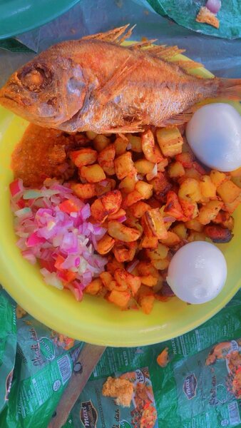 Savourez un authentique plat africain avec poisson, igname et légumes colorés. Parfait pour un repas exotique et généreux, idéal pour les amateurs de cuisine riche en saveurs.