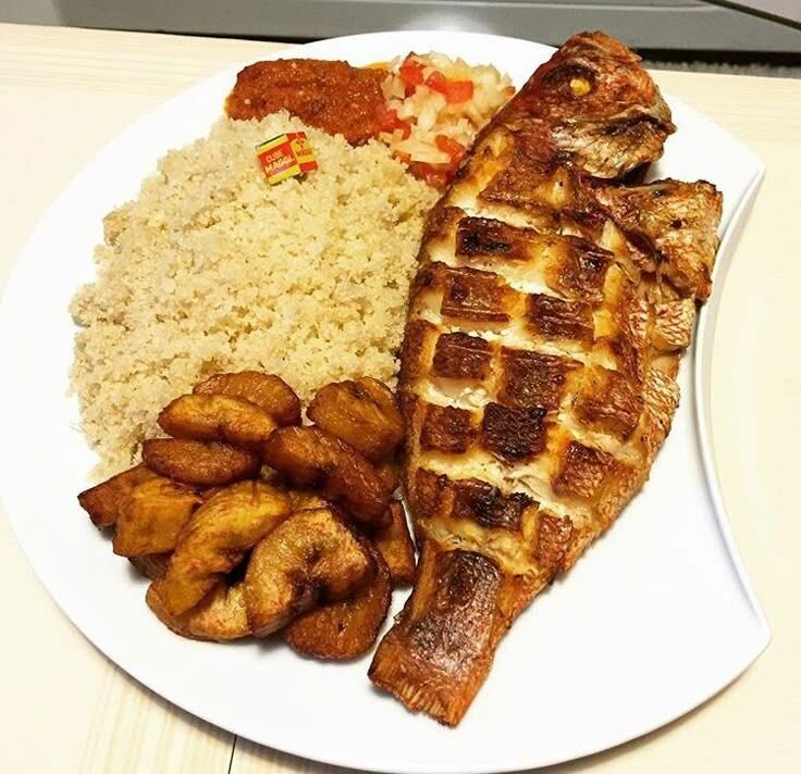 Dégustez notre poisson grillé parfaitement assaisonné, accompagné de riz parfumé et de bananes plantains croustillantes. Un repas exquis idéal pour les amateurs de cuisine exquise et saine.