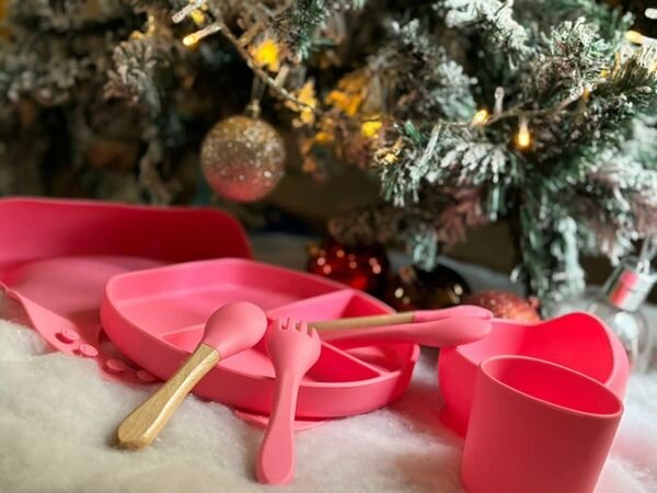 assiette en silicone antidérapant composé de :bavoir ,bol,cuillère,fourchette,assiette à compartiment et le gobelet