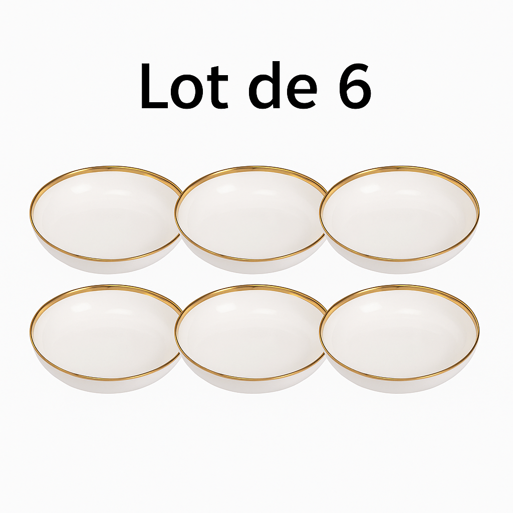 Élégant lot de 6 assiettes en porcelaine avec bord doré. Parfait pour rehausser votre table lors des occasions spéciales ou pour un usage quotidien. Résistant et facile à nettoyer, ce service ajoute une touche de sophistication à chaque repas.