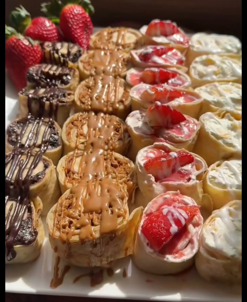 Découvrez notre assortiment de crêpes gourmandes, parfait pour satisfaire toutes vos envies sucrées. Chaque rouleau est généreusement garni de délices variés comme chocolat, fraises fraîches et caramel. Parfait pour un goûter entre amis ou un dessert en famille, ce plateau savoureux émerveillera vos papilles.