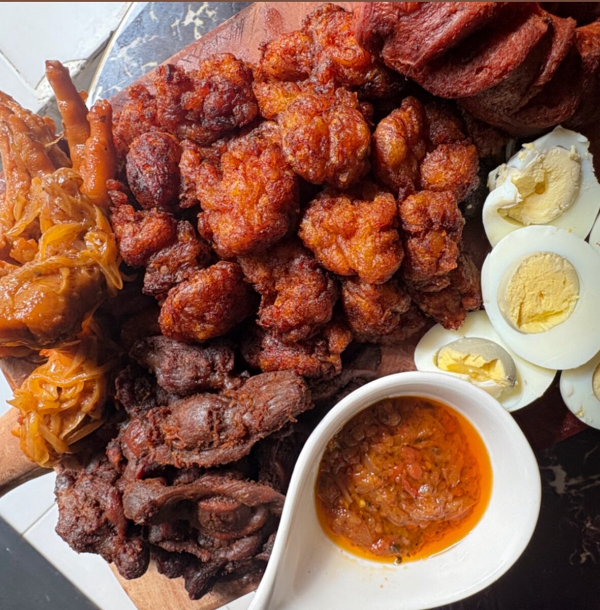 Découvrez un assortiment nigérian authentique avec poulet, œufs durs et légumes épicés. Idéal pour partager lors de vos réunions conviviales, ce plateau marie tradition et saveurs intenses. Parfait pour épater vos invités avec une explosion de goûts uniques.