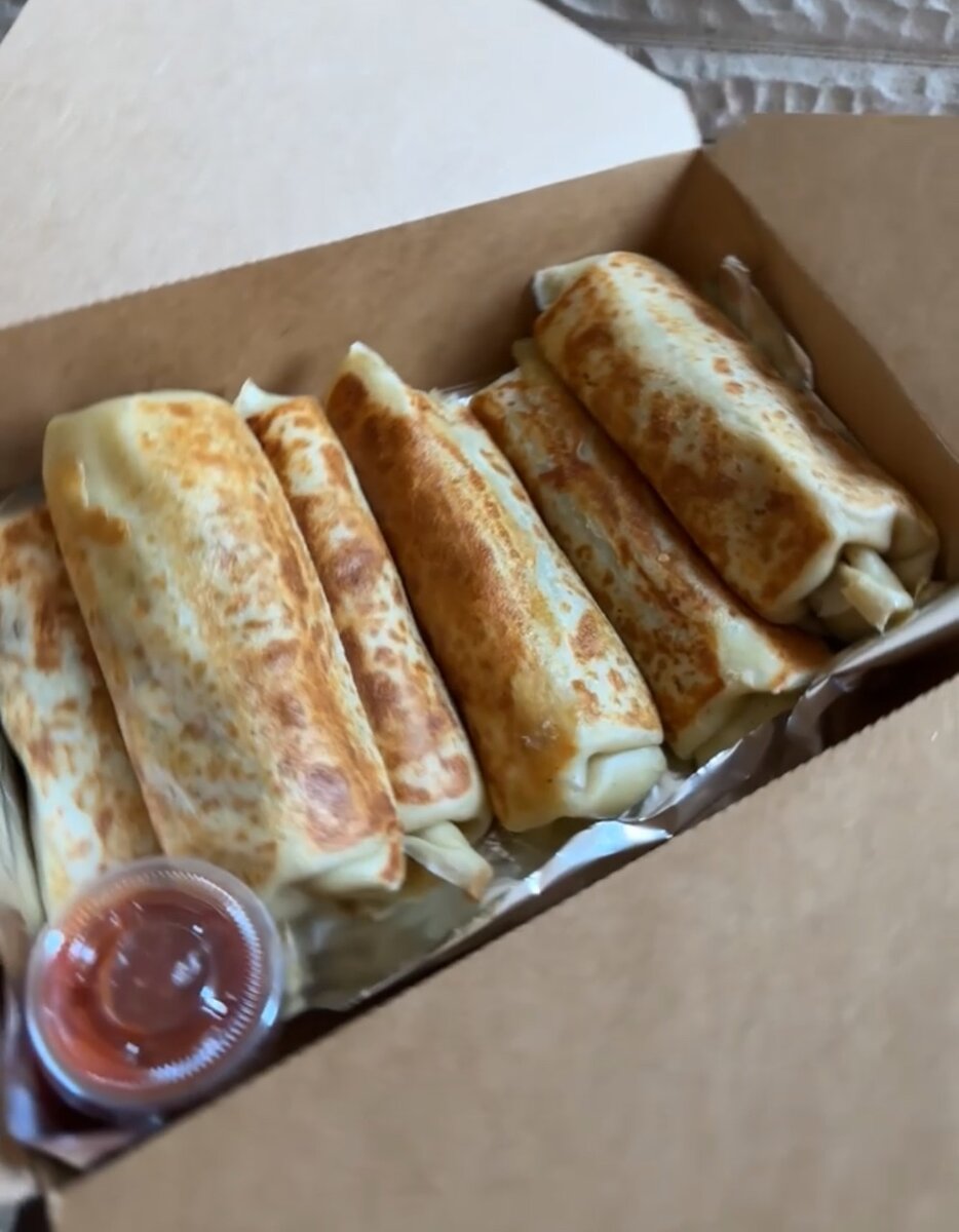 06 crêpes salées avec garniture à la viande hachée de bœuf , fromage et sauce béchamel, plus un supplément de sauce.