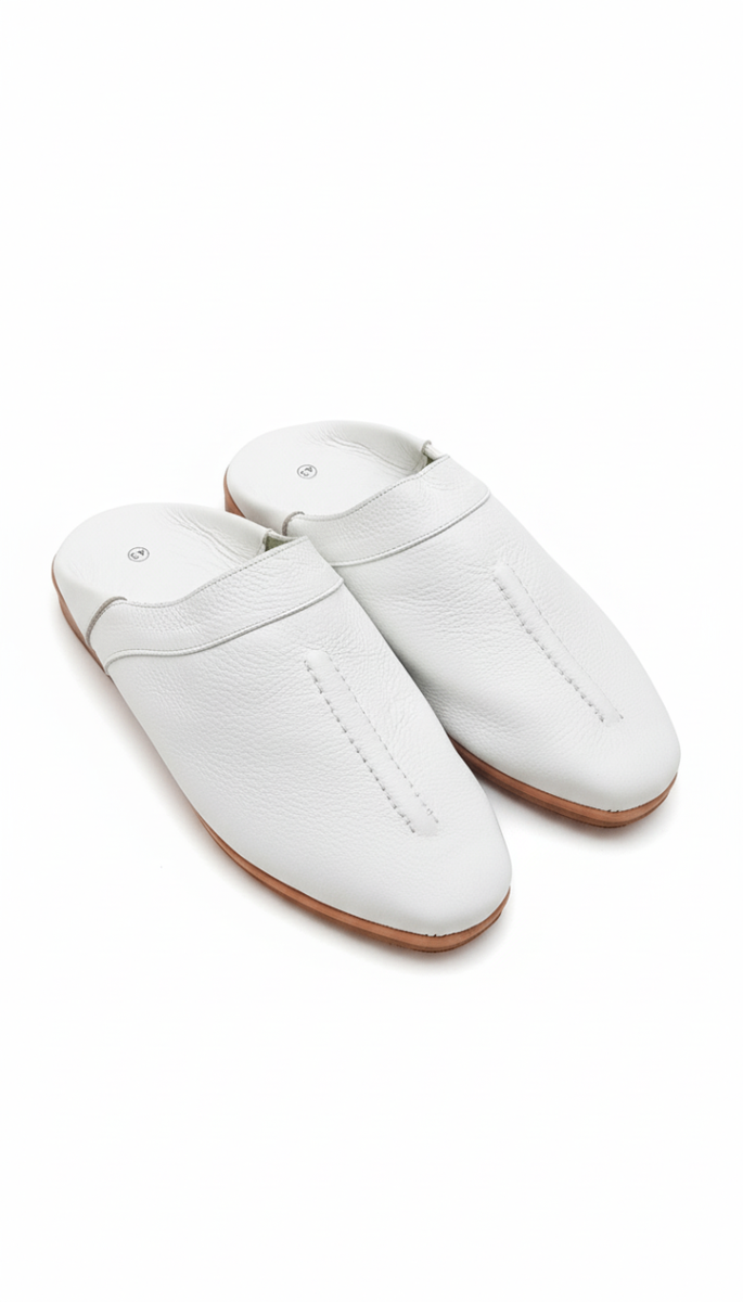 Step into comfort and style with these men's white leather mules. Featuring a sleek design and durable sole, these mules are perfect for casual outings or home relaxation. The premium leather ensures breathability and long-lasting wear. Ideal for anyone looking for both functionality and modern flair.
