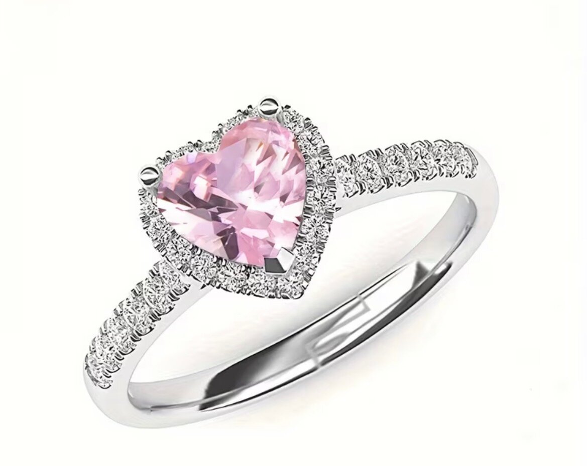 Élégante bague en forme de cœur, ornée d'une pierre centrale rose entourée de zirconia cubiques. Idéale pour les occasions spéciales ou comme cadeau romantique.