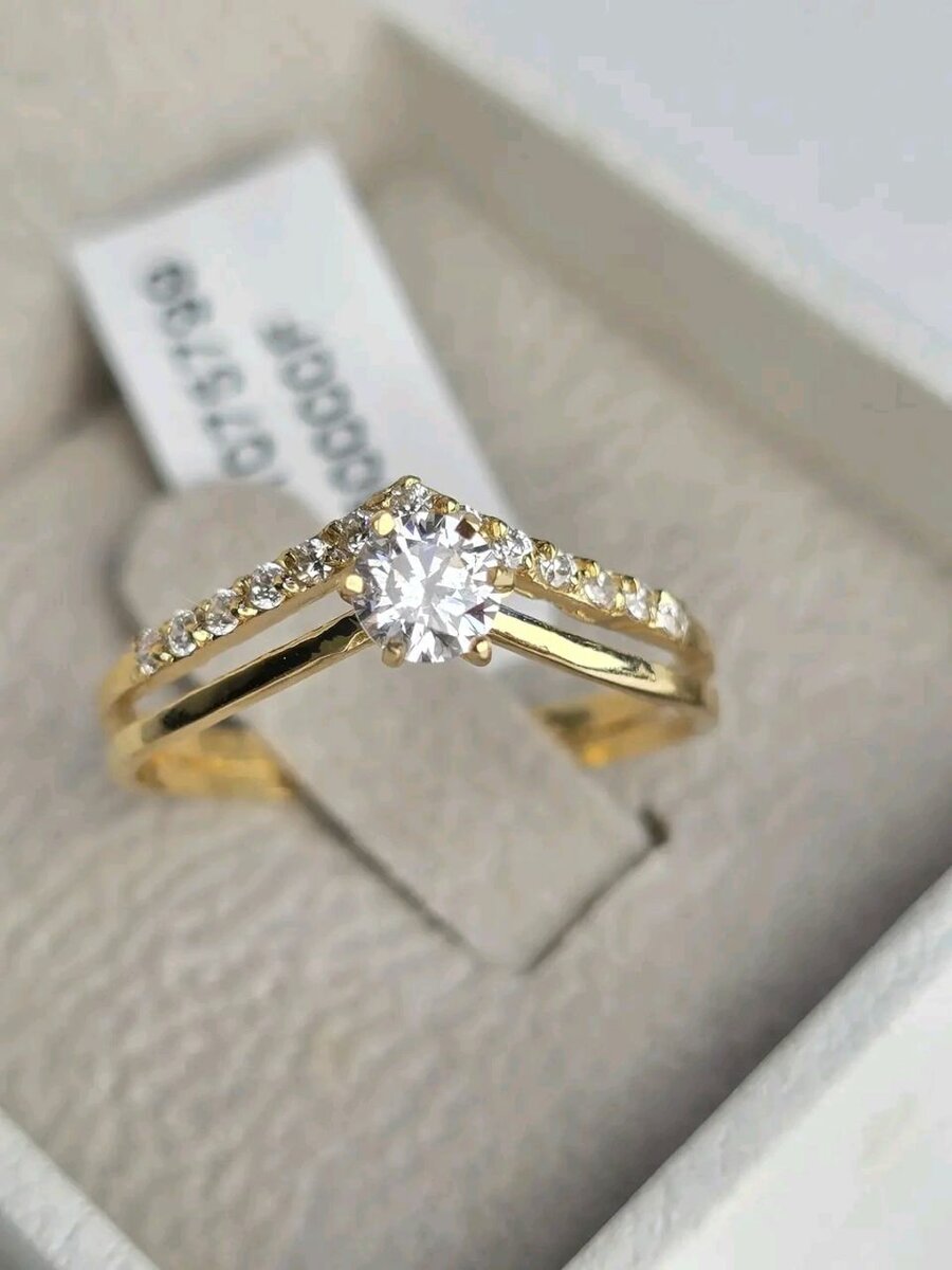 Élégante bague de fiançailles en or avec un diamant central et des diamants latéraux. Un choix idéal pour un moment unique.
