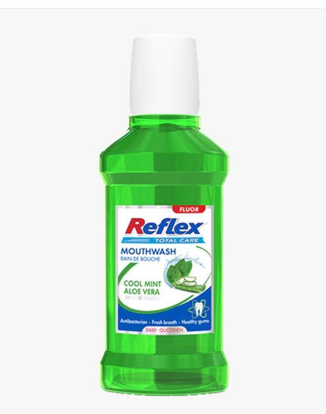 Découvrez le bain de bouche Reflex Total Care. À la menthe fraîche et aloe vera pour une haleine fraîche et des gencives en santé. Parfait pour un soin quotidien antibactérien.