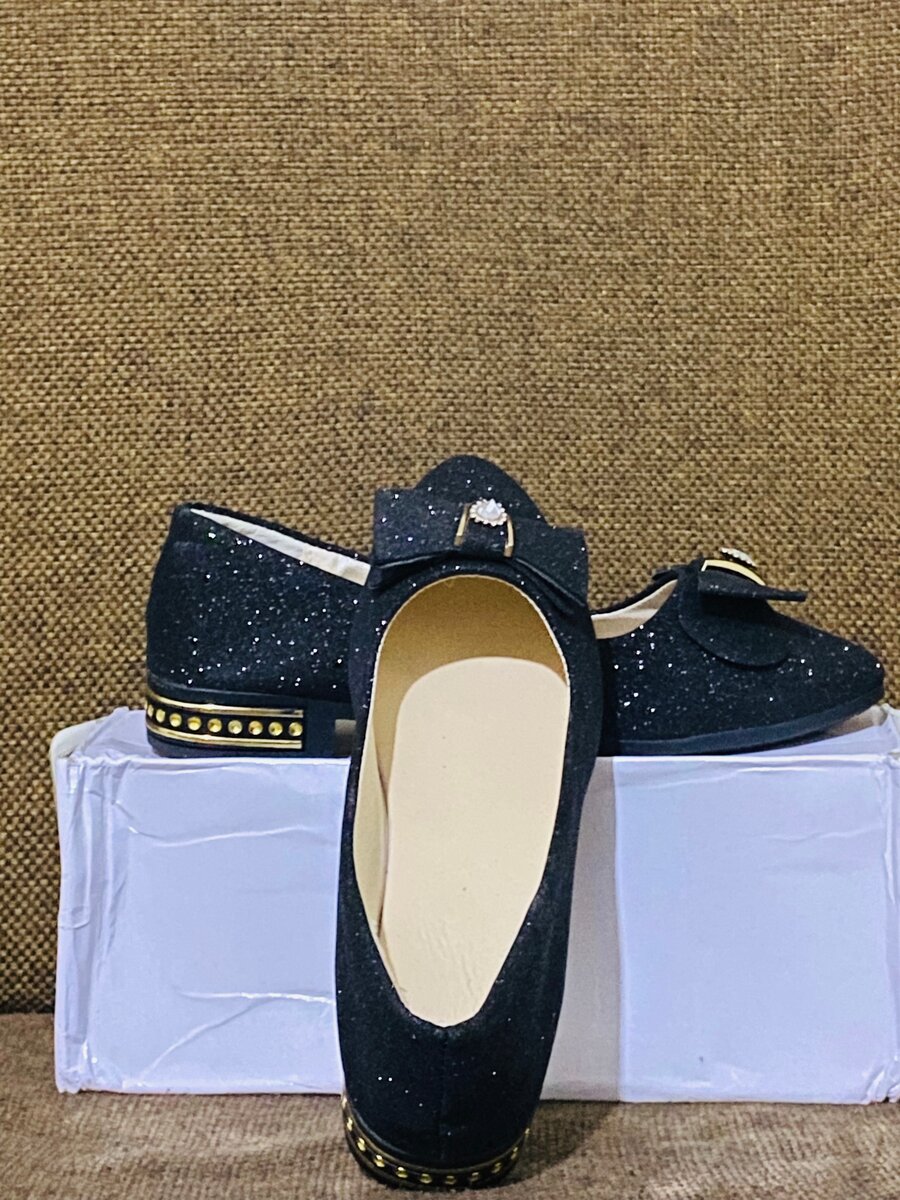 Ajoutez une touche de glamour à votre tenue avec ces ballerines noires pailletées ornées de détails dorés. Parfaites pour des soirées ou des occasions spéciales, elles offrent confort et style. Découvrez le mélange idéal de confort et de sophistication.