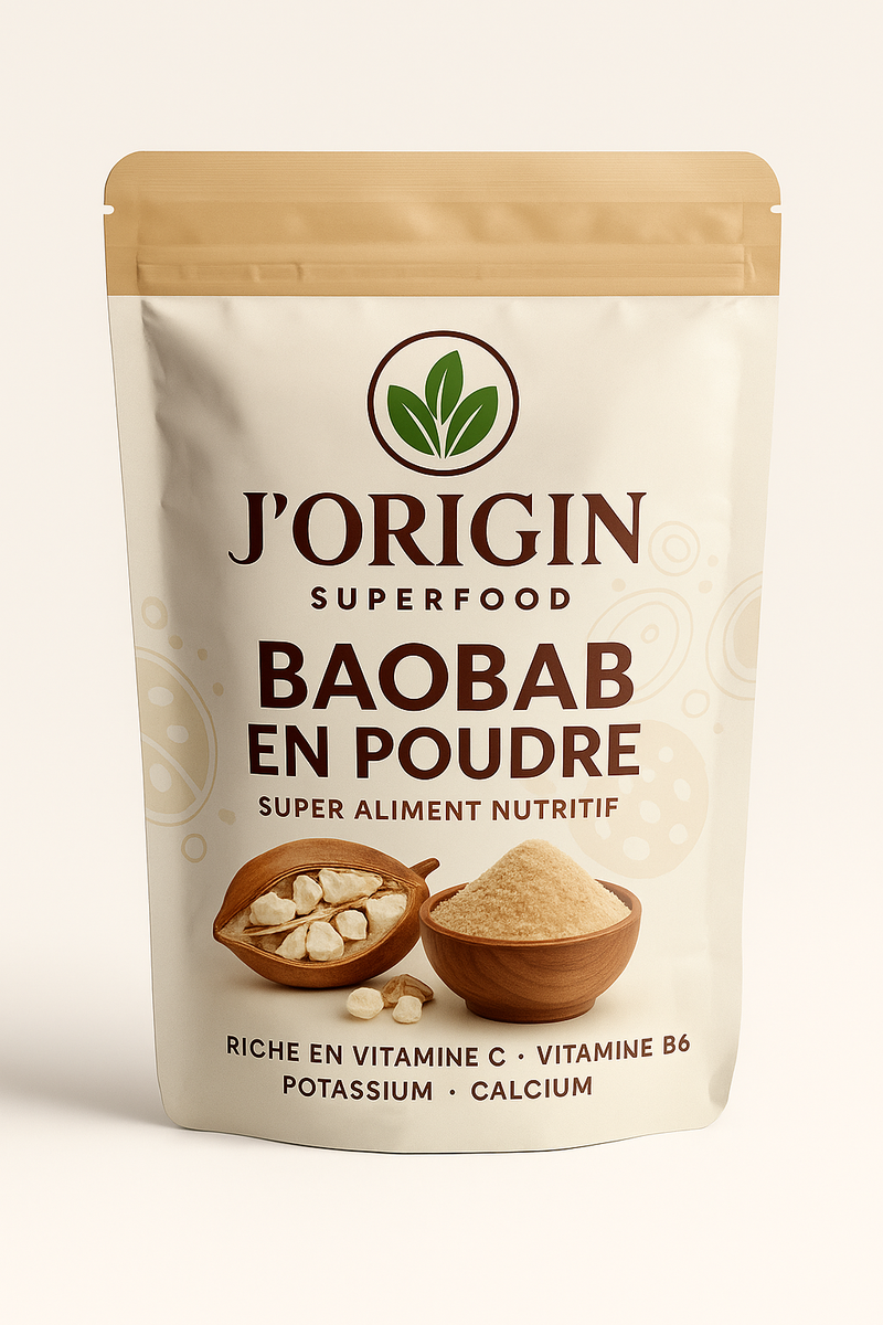Poudre de Baobab 100% Naturelle. Connue pour sa richesse exceptionnelle en vitamine C, jusquà 7 fois plus que lorange. Idéale pour soutenir votre énergie naturelle, donner de léclat à la peau et enrichir vos smoothies, jus et boissons healthy.Produit pur, sans additifs.