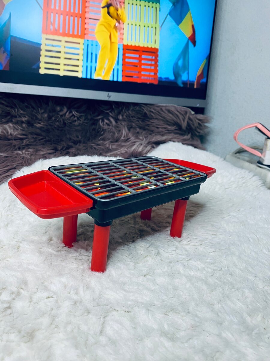 Un barbecue jouet amusant et coloré pour les enfants, idéal pour les jeux d'imitation. Comprend accessoires alimentaires en plastique. Parfait pour jouer en intérieur et développer l'imagination.