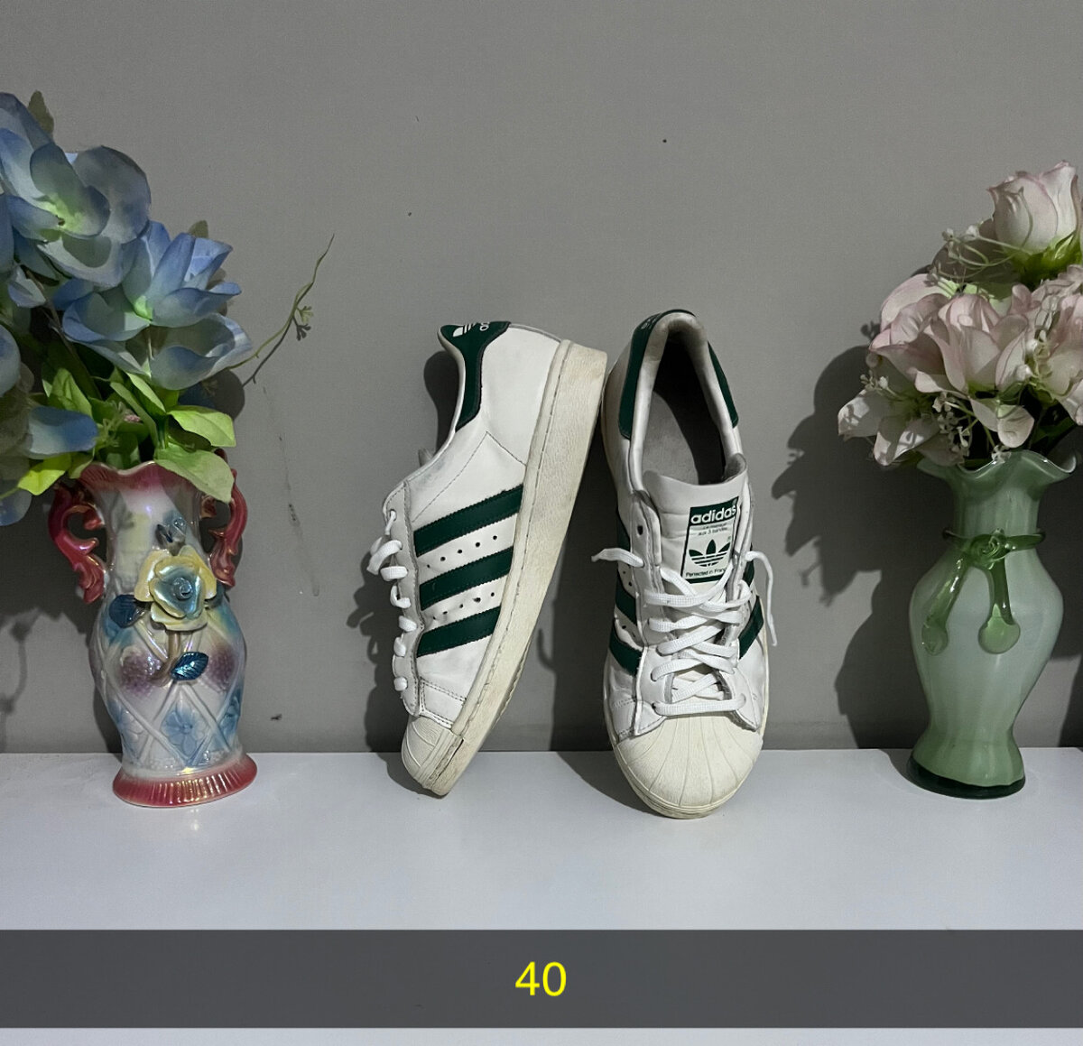 Découvrez le style intemporel avec ces baskets blanches classiques, idéales pour un look quotidien décontracté. Avec leurs bandes vertes distinctives, elles s'associent facilement avec une variété de tenues. Fabriquées pour le confort et la durabilité, elles sont parfaites pour la marche ou une journée en ville. Taille 40.