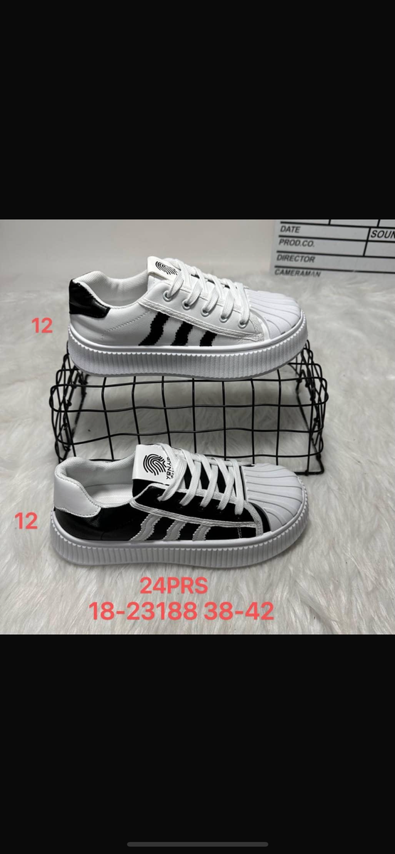 Baskets tendance blanches avec accents noirs. Idéales pour un look urbain décontracté. Taille 38-42 disponible.