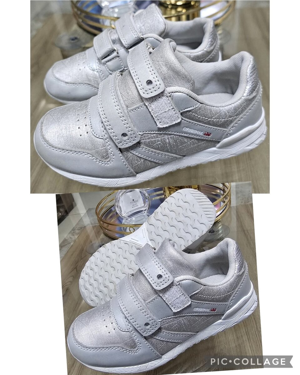 Baskets argentées pour enfants, offrant confort et style. Fermeture velcro pour un enfilage facile. Idéales pour l'école ou les sorties.