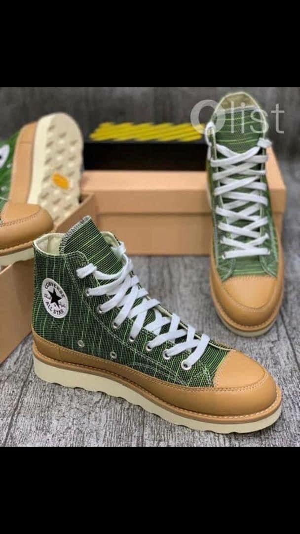 Découvrez l'élégance intemporel de ces baskets hautes en toile rayée verte. Parfaites pour un style casual-chic, elles offrent confort et robustesse grâce à leur semelle épaisse. Idéal pour ceux qui cherchent à allier style et confort au quotidien.