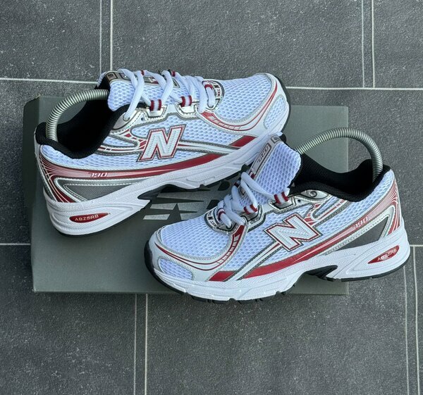 Paire de baskets New Balance blanches et rouges neuves, design sportif, stylées et confortables. Idéales pour la marche ou le sport. Pointures variées possibles.