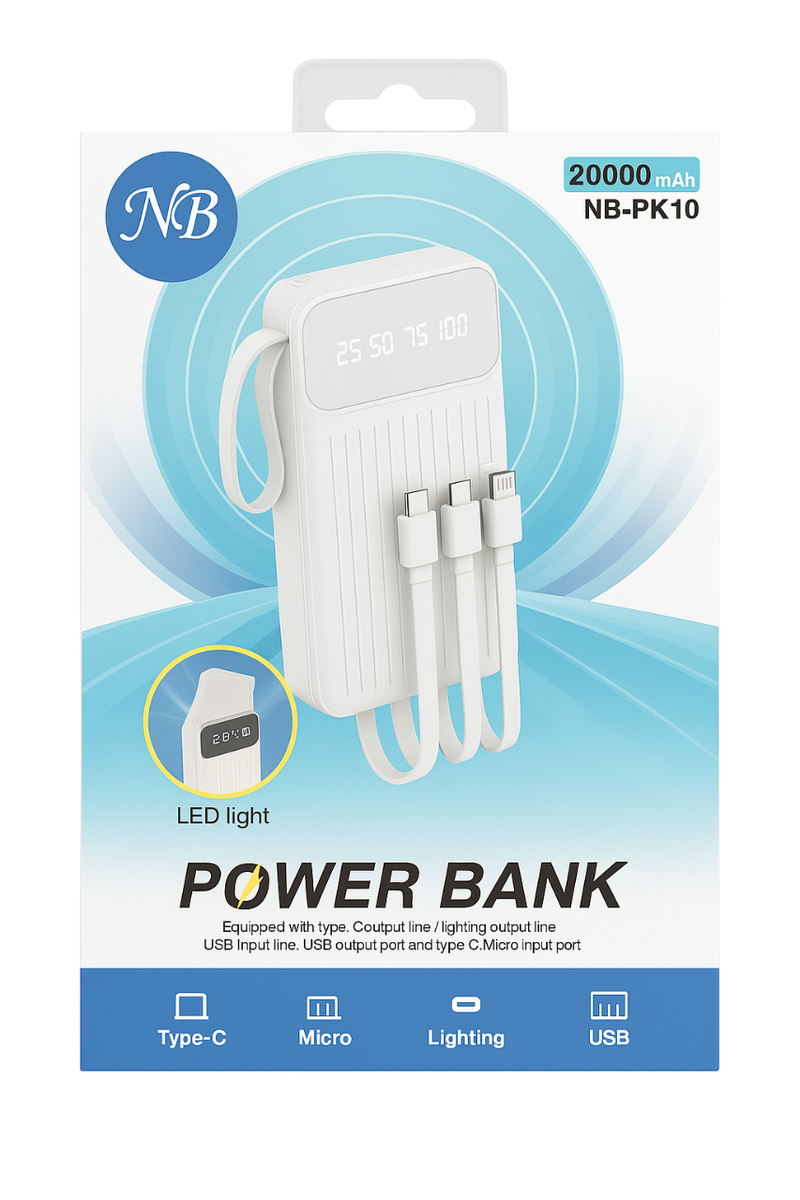 Optez pour la puissance avec cette batterie externe de 20000mAh. Équipée de ports Type-C, Micro, Lightning, USB et d'une lumière LED, elle assure une charge rapide et efficace. Idéale pour voyages et déplacements.