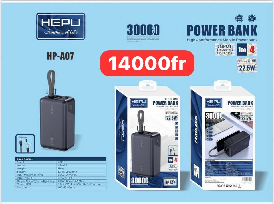Profitez de la puissance portable avec la batterie externe HEPU. Avec une capacité de 20000mAh, elle est idéale pour charger plusieurs appareils en déplacement. Dotée de deux ports de sortie et une entrée rapide, elle garantit une charge efficace et rapide. Parfaite pour les voyages ou l'usage quotidien.