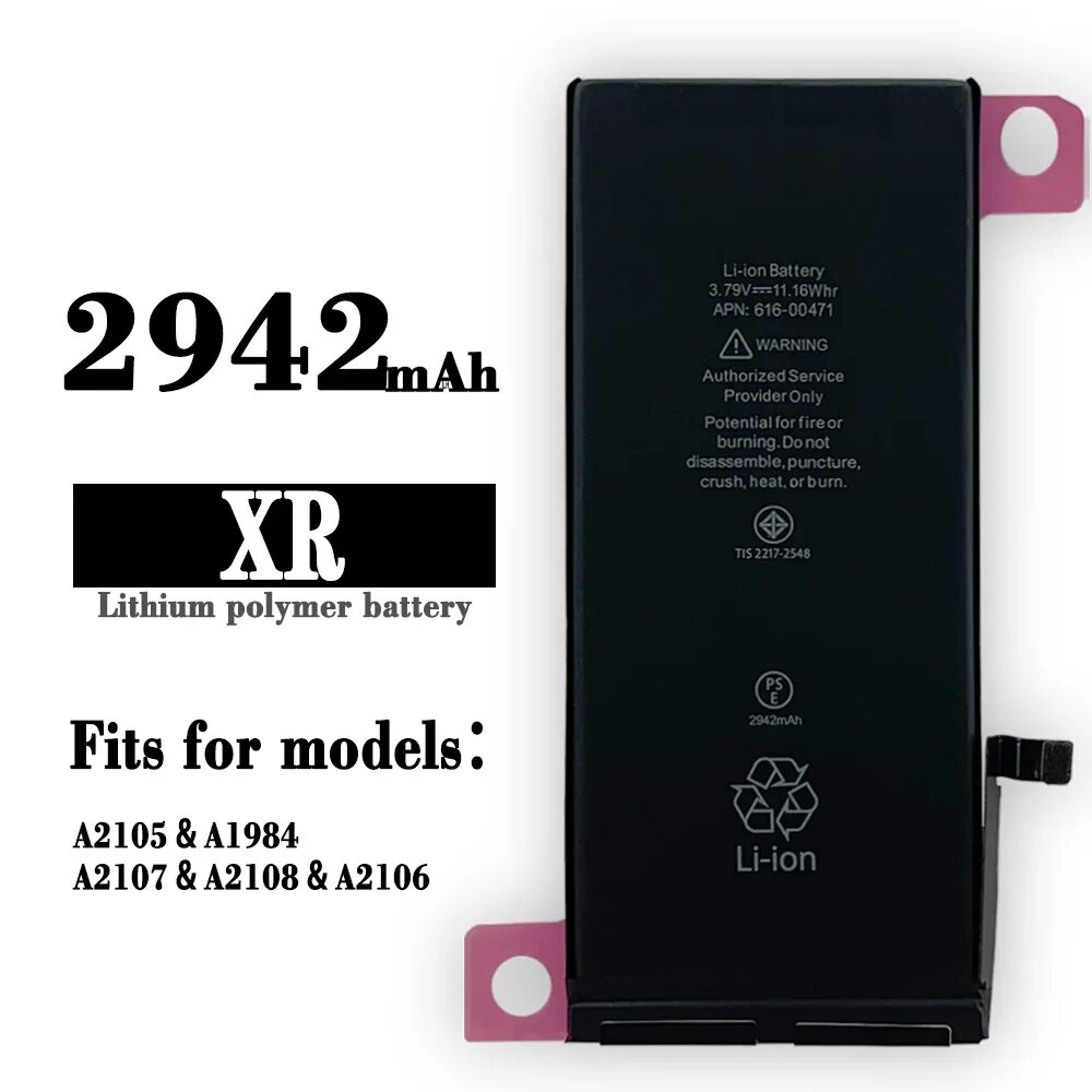 Batterie Lithium-ion pour iPhone XR - 2942mAh, tension nominale 3.82V, fabriquée en Chine. Compatible avec les modèles A2105, A1984, A2107, A2108, A2106.