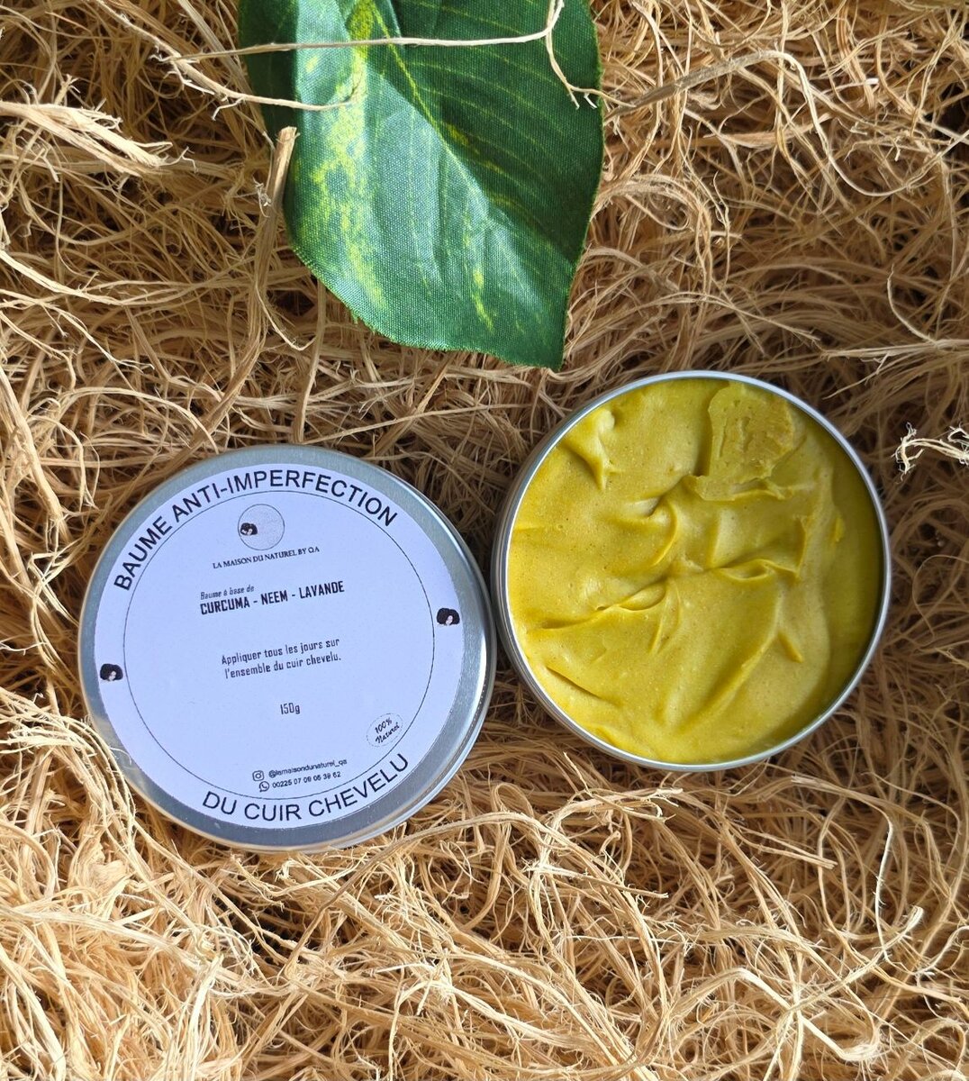 Optez pour notre Baume Anti-Imperfection pour cuir chevelu, enrichi en curcuma, neem et lavande. Idéal pour soulager et revitaliser votre cuir chevelu, ce baume naturel est parfait pour apaiser les irritations et favoriser la santé des cheveux. Il traite aussi bien les pellicule que les plaques blanchâtre au niveaux du cuir chevelu et le psorias.Appliquez régulièrement pour des résultats visibles et un coiffage facilité.