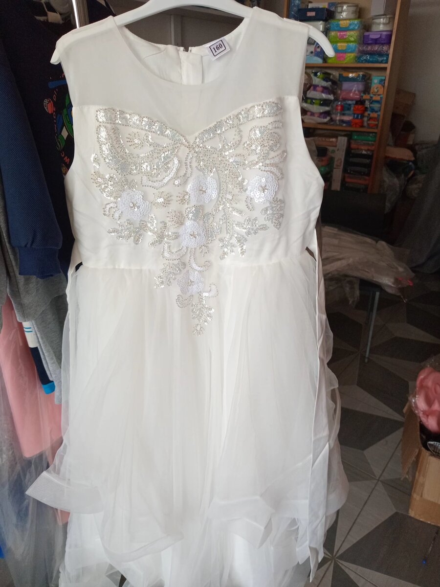 Beautiful beads and sequin dress ideally for weddings, baptism, easter sunday etc. Size: 160cm, for 12 to 16 years old. Depends on body size of girl. Bust size: 30-31 inches (normal tape measure) Dress length: 44 to 45 inches