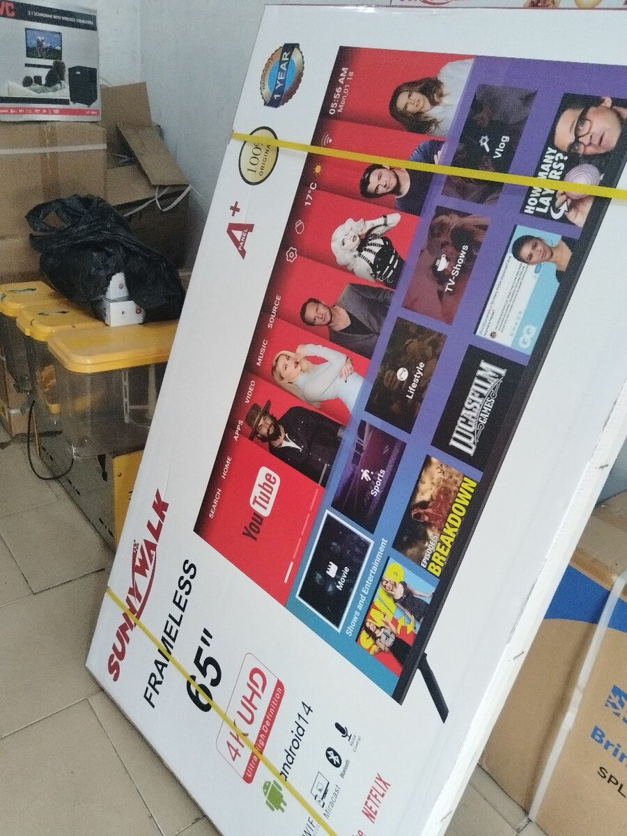 High quality sunny walk TV strong unique flame less 4k UHD smart android TV wifi USB hdmi wireless networks YouTube Netflix quality picture display resolution 2160pixels one years warranty
