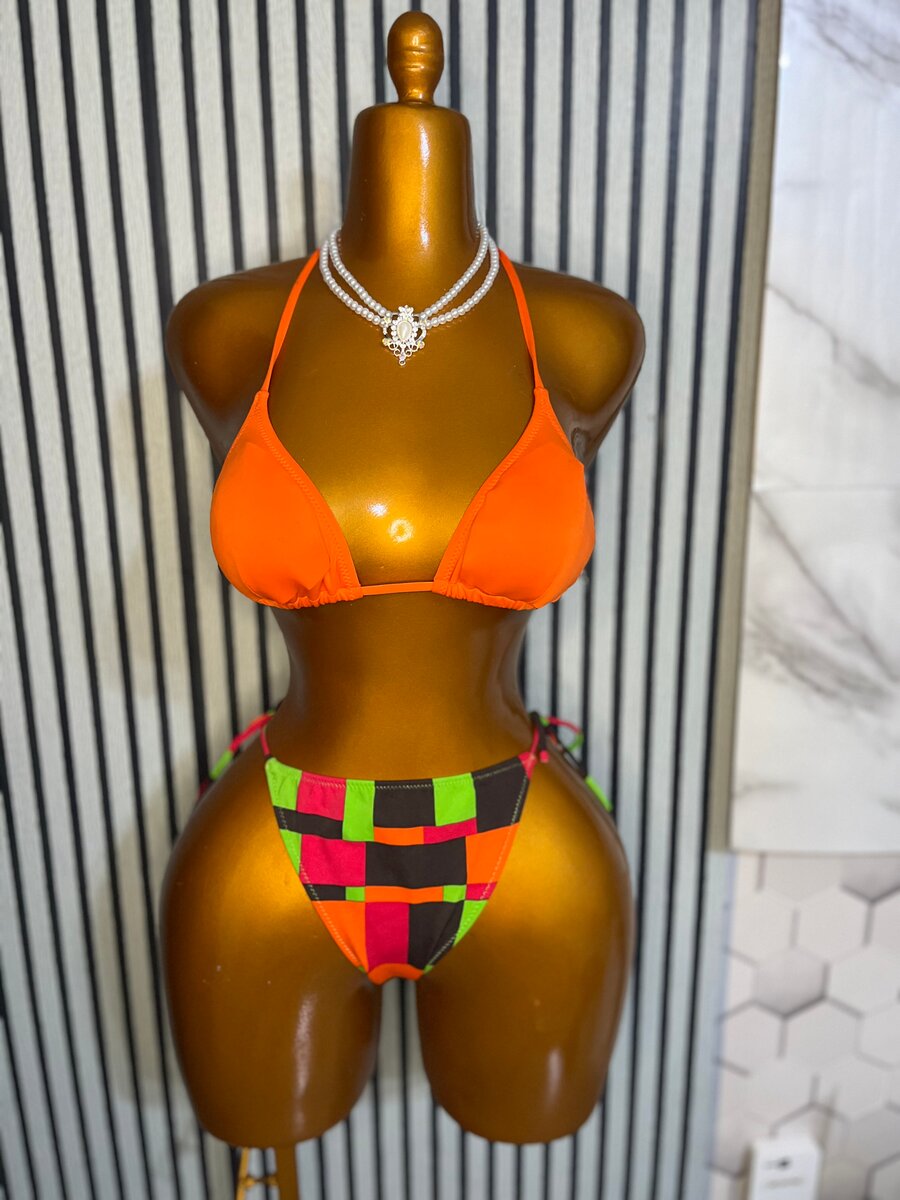 Offrez-vous ce bikini vibrant avec son haut orange éclatant et bas à motifs géométriques. Idéal pour vos journées ensoleillées à la plage ou à la piscine, il allie élégance et confort. Parfait pour celles qui aiment se démarquer avec style tout en profitant du soleil.