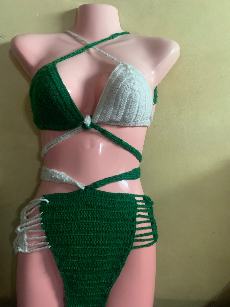 Découvrez ce bikini crochet bicolore, un mélange unique de vert et blanc. Parfait pour les journées à la plage, il assure confort et style. Les lanières croisées ajoutent une touche audacieuse et séduisante. Fabriqué en matériaux doux, c'est un choix idéal pour un look tendance. Soyez au top pour vos piscines et plages
