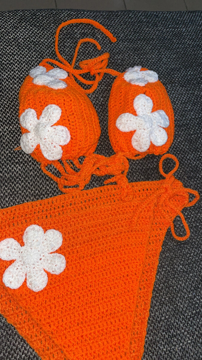 Ce bikini en crochet orange vif avec motifs floraux blancs est parfait pour l'été. Fait main et confortable, il offre un style unique et vibrant pour la plage ou la piscine. Idéal pour se démarquer avec élégance.